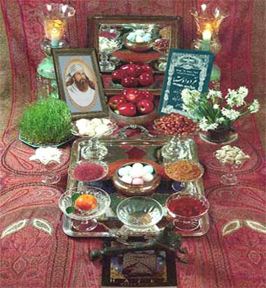 - سفره هفت سین ازهفت سینی، تشکیل می شود » انسان های سرسفره که آرزو دارند که از من خویش سپنته من بسازند وکتاب مقدس، نماد اهورامزدا . شیر وتخم مرغ و سپیدی ، نماد وهومن (نیک منشی ) . آتش (شمع وچراغ )، نماد اردیبهشت( بهترین راستی ). سکه ، نماد شهریور( تسلط برنفس ) . زمین و سبزه و میو ه جات که اززمین برمی آید ، نماد سپندارمزد (مهروفروتنی) . آب وشربت ، نماد خرداد (دانش اندوزی ورسایی ) و گل وگیاه، نماد امرداد ( جاودانگی ) می باشند . امید که همه ما بتوانیم مفاهیم هرکدام از این هفت پایه عرفان زرتشتی را دریابیم و ازخداشناسی وخداجویی آغاز کرده و با پیمودن شش فروزه دیگر به جاودانگی برسیم.