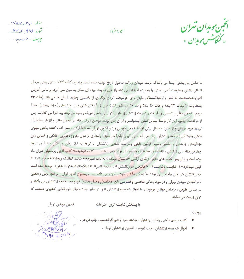 درپاسخ به نامه شماره 6965/13 تاریخ 15/4/87 به آگاهی می رساند که بنا به باور دینی زرتشتیان: